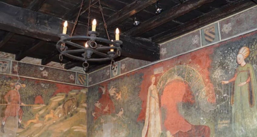 La corte rustica Borromeo presenta nella stanza al primo piano un ciclo di affreschi tardogotici di valore indiscusso. Le scene raffigurano episodi di caccia e di amore cortese dal significato ancora oggi in parte ancora misterioso. I dipinti si sviluppano senza soluzione di continuità lungo tutte le pareti dell’ambiente, favorendo la completa immersione del visitatore nel clima culturale del secondo Quattrocento.