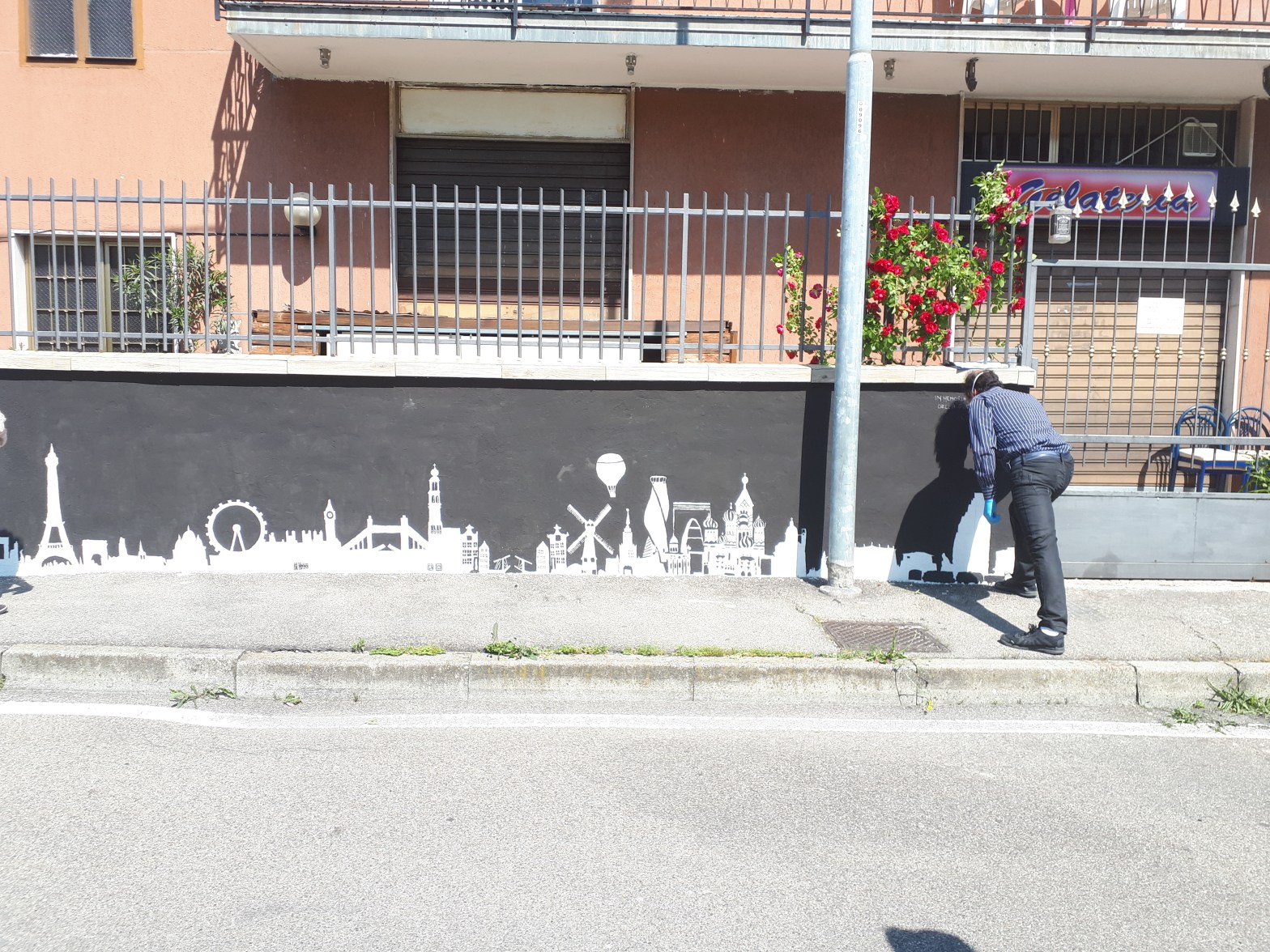 Che cosa rappresenta il murales? 17 edifici simbolo di altrettante grandi città del mondo, Hong-kong, Singapore, Kuala Lampur, Sidney, Tokio, Pechino, Dubai, Il Cairo, Palmira, Rio de Janeiro, New York, Gerusalemme, Parigi, Londra, Amsterdam, Mosca, e, infine, Desio. A testimonianza di una realtà drammatica che non ha guardato in faccia colore della pelle, etnia o religione.