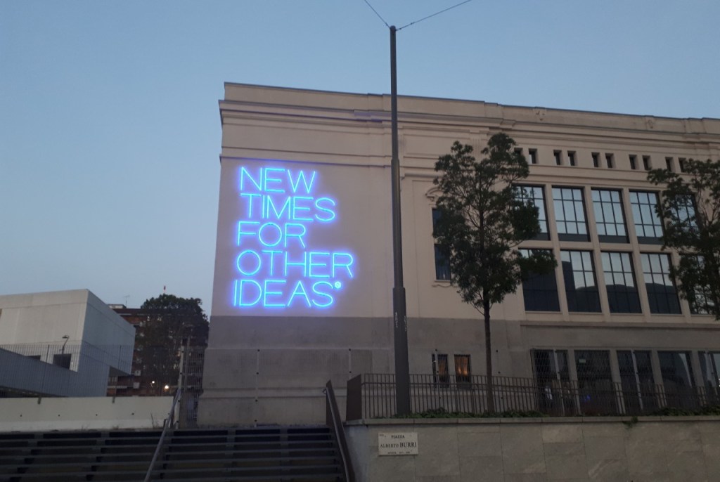 La peculiarità del “beso” (bacio), dell’artista cubano Wilfredo Prieto, sta più nell’idea che non nel risvolto pratico dell’opera stessa. Protagonisti sono due massi erratici provenienti dalle ex zone glaciali del Trentino, in questo caso modellati dal ghiaccio e non dall’artista. Dall’altra parte Maurizio Nannucci, nome dalla fama non così importante, almeno rispetto a quanto avrebbe meritato, con la doppia scritta “nuovi tempi per altre idee”, riporta l’attenzione sullo storico edificio del Padiglione 3, recentemente assegnato dal Comune a Generali tramite bando e in attesa di rilancio, in cui è contenuto un evidente richiamo anche al frangente storico che ci ha appena segnato.