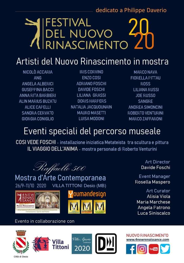 “Questo Festival del Nuovo Rinascimento si sviluppa in stretta simbiosi con la rassegna culturale di Ville Aperte in Brianza – racconta il direttore artistico Davide Foschi – sarà un evento per forza segnato dal Cinquecentesimo della morte di Raffaello, che omaggeremo chiedendo ai 27 artisti invitati ad esporre, di rifarsi al maestro urbinate, nel suo modello di Rinascimento più magico e alchimistico, rispetto alla declinazione scientifica di Leonardo che abbiamo celebrato l’anno scorso. Una scelta che va in controtendenza rispetto ai passati festival è stata invece quella di non conferire nessun premio particolare, per riservare tutti gli onori alla magnifica villa desiana, che ospita fra l’altro nei suoi eleganti ambienti una graziosa cappella privata di epoca rinascimentale. La modalità di somministrazione culturale che abbiamo deciso di adottare per quest’edizione segnata dal Covid, comprende le visite guidate alla villa e alla mostra il venerdì, in fascia serale e in un’atmosfera quindi speciale, quindi in orario diurno il sabato e la domenica.