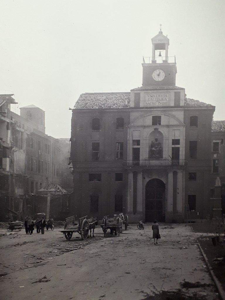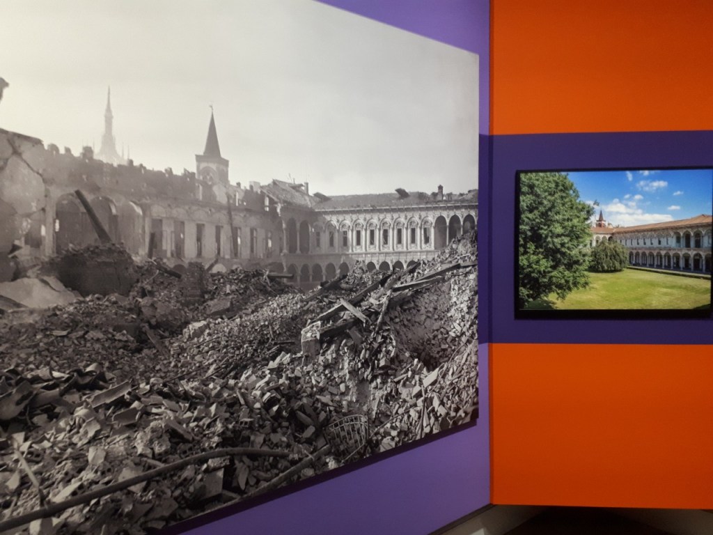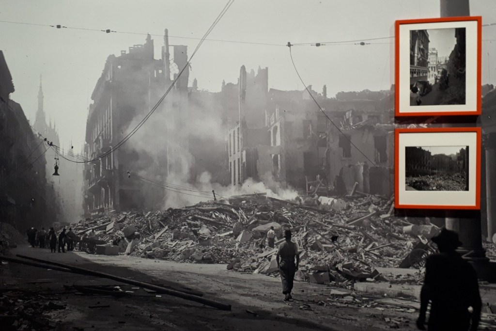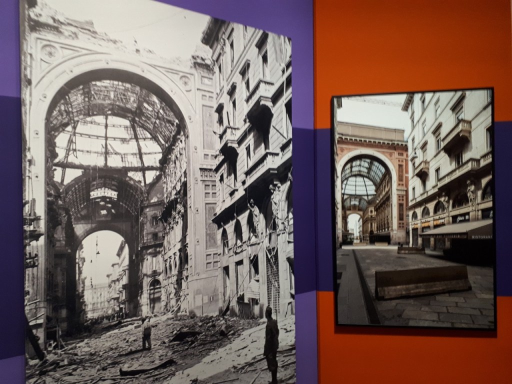 Fa riflettere inoltre, nota curiosa con cui è pensata la mostra, l’accostamento tra vedute post bombardamento e lockdown, in cui le atmosfere catturate non sono poi tanto distanti, trascurando le divergenze date dal bianco e nero. Emblematici in questo senso sono gli scorci di via Manzoni, lato via della Spiga, la via vittorio Emanuele, con i portici oggi completamente rinnovati, ma anche poli di studio come la Ca’ Granda, l’ex ospedale sforzesco oggi parte dell’Università Statale, impietosamente segnato dagli attacchi in quota, nel chiostro e nel cortile. La mostra porta quindi in sè e nell’allestimento un ricco valore simbolico e psicologico, che fa pensare naturalmente al dramma della ricostruzione, in due momenti della nostra storia recente, che al netto dei contesti in cui nascono, sono più vicini di quanto sembrino ad una prima e rapida occhiata. La speranza è che oggi si possa riuscire a ripartire come si riuscì quasi 80 anni fa, in mezzo a mille difficoltà e meno possibilità di oggi.