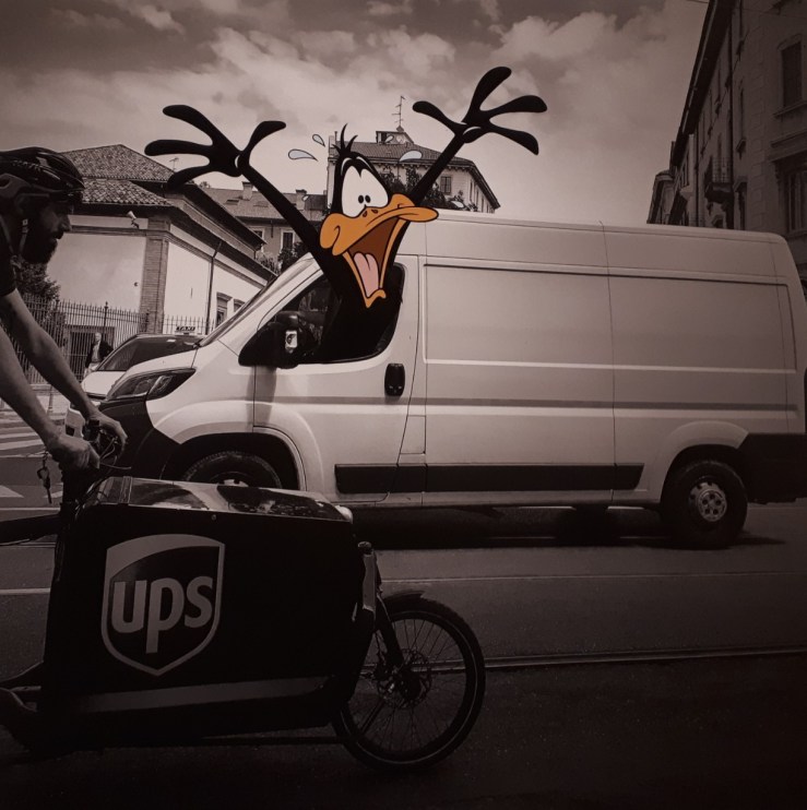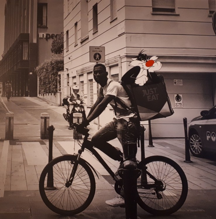 Nascono così ambientazioni surreali in cui troviamo uno sciatore percorrere l’iconica Torre Hadid della compagnia assicurativa Generali in discesa; Gatto Silvestro che spunta dallo zaino di un rider; Batman che si erge a difesa della Torre Isozaki, sede di Allianz; ma anche fuori serie che impreziosiscono interessanti vedute milanesi del centro. Combinazioni geniali capaci di dar vita a fotocomposizioni ricche di fantasia e che aggiungono quel plus di animazione, a scorci altrimenti dominati dalla monumentalità glaciale degli skyline milanesi.
