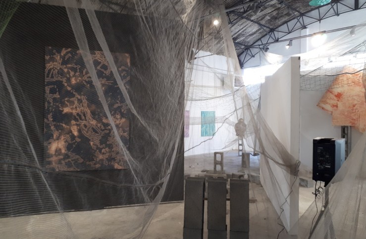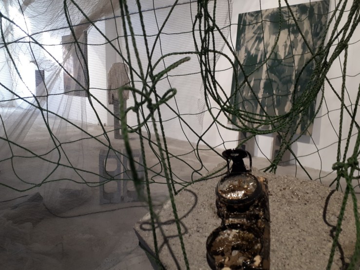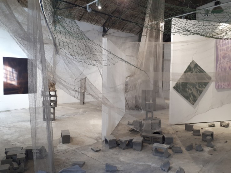 Ad animare il tutto contribuisce uno spazio disseminato di readymade ottenuti ricorrendo abilmente ad abiti, copertoni, taniche e altri oggetti di uso comune, cosparsi di resina, per un effetto di straniazione totale della scena, mentre pezzi di cemento e reti instillano nello spettatore un senso di perdita a dir poco spaesante. La presenza umana è azzerata e il messaggio dato al pubblico, informato a priori di questa nuova possibile era, sembra molto chiaro: tutto è da ricostruire. Il quadro è diventato inoltre scenografia ideale per vedere in azione una performance dominata dalle creature della wasteland bavardiana, curata da Sofia Baldi e intitolata People of Ruins, grazie alla collaborazione con Lobo, laboratorio multidisciplinare e d’avanguardia di artisti e psicologici nato e diretto dalla mente di Virginia Roghi.