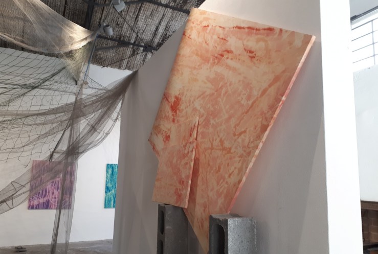 All’Avantgarden Gallery di Milano, realtà che lavora dal 2007 sulle potenzialità dei fenomeni artistici del comparto underground, il georgiano – da anni attivo a Parigi – ha infatti dato vita in Acid Bleach dal 29 ottobre, ad una scenografia teatrale distopica frutto di tre settimane di “art in residence”, se così vogliamo chiamarla. Come già fatto nel 2018 al Macao per la mostra Coco Galba, nella location di via Tertulliano, Mosa ha giocato sull’immagine di queste aree isolate, nella visione comune sinonimo di degrado. Ma se nell’occasione precedente le periferie erano diventate insolite reliquie, che, per come ce le descriveva l’artista, ci apparivano persino quasi civilizzate, qui il quadro offerto è di ben altro tenore, desolante: un wasteland, come ama definirlo lui stesso. Le opere proposte impattano clamorosamente alla vista grazie al metodo della scoloritura tramite candeggina (tecnicamente “bleach”) applicata a tele dal gusto informale.