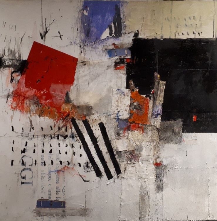 La galleria di via IV novembre, che in autunno ha riaperto i battenti dopo il lockdown, unisce cultura ai servizi immobiliari, e proprio di recente si è accostata al marchio WS Immobiliare, il prestigioso gruppo monzese che vanta 7 agenzie sul territorio di Monza e della provincia brianzola. A questo proposito, la pittura di Elli, all’insegna del collage e della materia murale viva dalle tonalità stinte, ci potrebbe schiudere un collegamento agevole e diretto con il periodo che viviamo. Ma la novità dell’ultimo capitolo artistico dell’autore riguardo l’apertura a una gamma anche più viva, dove i rossi assumono ora una declinazione più accesa, ci fa venire qualche dubbio.