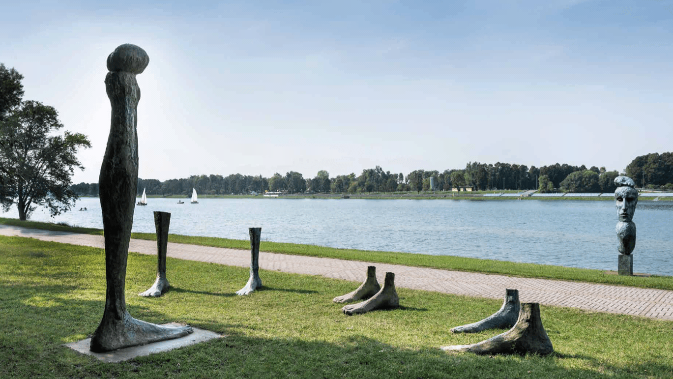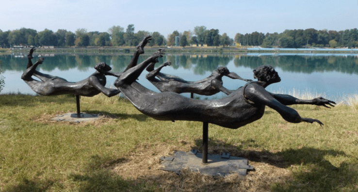 Così, nel segno di un’interessante congiunzione fra attività fisiche e rigeneranti e la sfera culturale, l’eccellenza milanese dello svago all’aperto, gestita da Città Metropolitana e dall’Istituzione Idroscalo nata nel 2018, ha trovato dal 2011 un primo e importante risvolto concreto del futuro parco d’arte, con la collocazione delle prime opere en plen air, alcune di notevole formato, lungo la riva est del comprensorio, frutto di donazioni e prestiti anche importanti. Nel 2013 l’idea ha iniziato a prendere visivamente uno spazio di rilievo nell’area, e anche ufficialmente con l’inaugurazione del primo nucleo di 20 installazioni open air lungo un percorso sviluppato per un chilometro sul versante orientale del parco, grazie al sostegno di partner privati come Fondazione Materima di Castelbeltrame e Fondazione Banca del Monte e alla collaborazione con La Permanente. La scelta degli artisti selezionati da un Comitato Scientifico è ricaduta fra gli altri su nomi dal peso influente nel panorama scultoreo italiano e internazionale del dopoguerra, se si pensa alle figure di Giovanni Campus, Giacomo Manzù o di Mauro Staccioli. Il filo conduttore è il legame, sottile o marcato, delle varie lavorazioni con lo specchio d’acqua e la vegetazione circostante. Un leitmotiv che raggiunge l’apice della sintonia con il paesaggio in esempi come il Fauno di Manzù, e che diviene ancor più spiccata nel Grande nuotatore di Minguzzi, sottolineata dall’esposizione fronte lago.