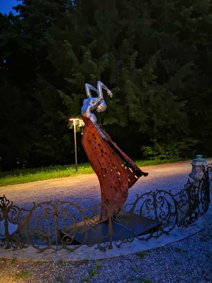 L’opera forgiata nel 2018, già esposta di fronte a Villa Borromeo di Arcore, in quel caso anche in una modalità notturna assolutamente valorizzate, è una miscela ben congegnata tra l’acciaio zincato del corpo della ballerina che conferisce un aspetto molto lucido, e l’acciaio Corten che dà il tipico effetto brunito e “arrugginito” al vestito. E come detto, riassume perfettamente la capacità di Ambro nel saper sintetizzare le due anime opposte della donna, come già fatto in un’altra opera del 2002, Leggiadria. Armonia è nata dopo la serie dei tori che rappresentano un altro tipo di soggetti ricorrenti nella sua sensibile produzione, sempre oscillante tra estremi stati d’animo interiori, e dove però emerge solo l’elemento prorompente.
