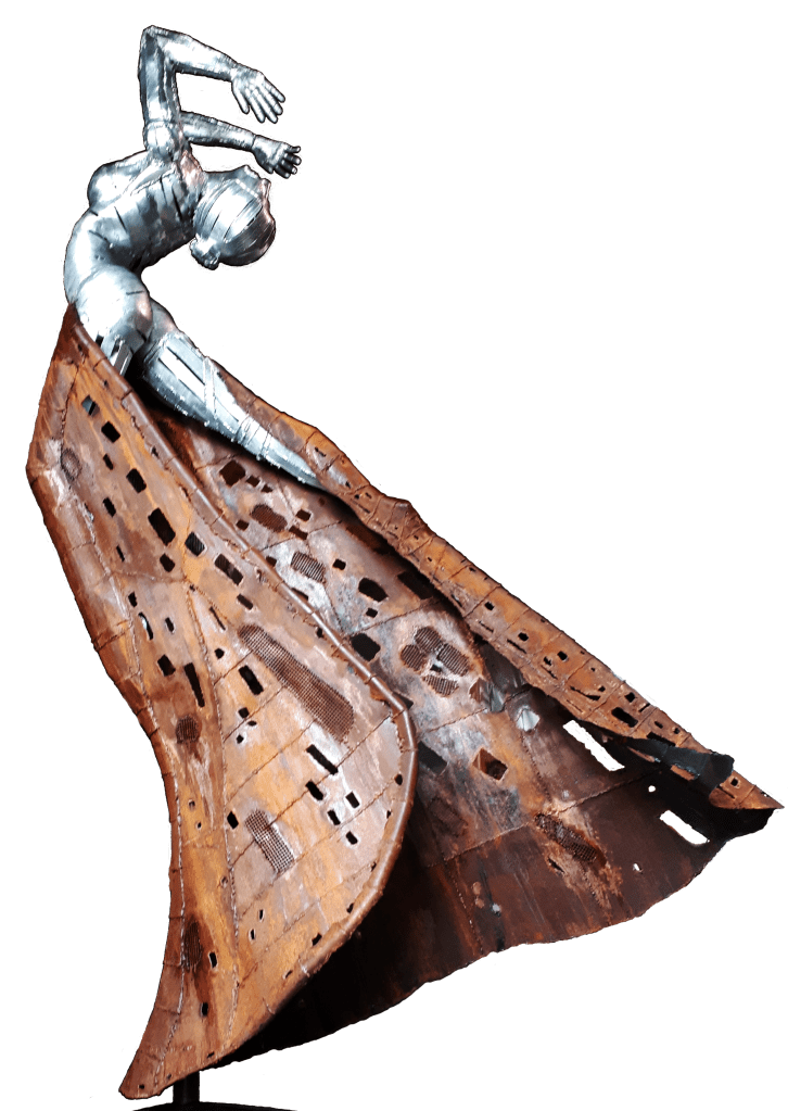 “Dopo aver realizzato due imponenti Tori, ho voluto creare questa ballerina molto particolare. Ho pensato alla contrapposizione estrema. Da una parte la potenza, la virilità, la voglia di abbattere gli ostacoli per arrivare agli obiettivi con lʼeleganza mentale di un animale fiero, dallʼaltra la ballerina, per me ispirazione di eleganza, leggerezza e delicatezza di movimenti e al tempo stesso rappresentazione di una grande forza e perseveranza, atta ad arrivare al raggiungimento della perfezione. Spero così che Armonia riesca ad emozionare perché credo che un artista possa ritenersi appagato se riesce, con la sua opera, a trasmettere emozione. In questo caso, il primo pensiero è stato un omaggio alla donna, alla sua bellezza e intelligenza ma non solo, alle sue contraddizioni, la sua forza e la sua debolezza, la sua grinta e la sua dolcezza. Ecco allora il lungo abito disomogeneo, pieno di strappi e di pezze che coprono i tanti buchi che rappresentano le difficoltà che ha dovuto affrontare nella crescita, se parliamo di individuo, o nella sua evoluzione, se parliamo di specie, per arrivare a dimostrare la sua grandezza. Non a caso, la materia di cui è composta è indistruttibile, a prova del suo grande valore. Lʼaltezza dellʼabito ha una duplice funzione. Se da una parte può significare lʼinfinita strada dellʼemancipazione, del riconoscimento dei suoi diritti, dallʼaltra serve ad elevare la stessa verso il cielo, a dimostrare quali vette sia in grado di raggiungere”.