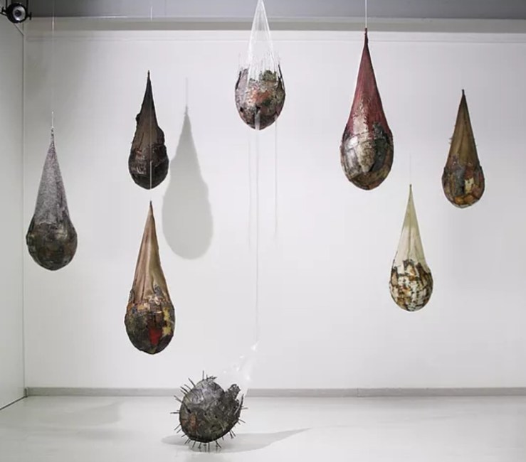 E in questo inusuale processo di creazione artistica che trascende il carattere figurativo, così chiaro a prima vista, c’è ancora qualcosa in più, qualcosa di nascosto e sfuggente sotto la superficie del visibile, che è Cereda stesso a svelarci. “Capita molto spesso, mentre mi approccio ad un nuovo lavoro, di non avere esattamente a fuoco dove arriverà il risultato della mia elaborazione. Per fare un esempio pratico, quando ho iniziato a realizzare l’opera Noi siamo lacrime, avevo in mente più una forma che non cosa questa forma volesse rappresentare. Poi, dopo il primo pezzo realizzato, il significato di queste lacrime mi si è improvvisamente rivelato. Richiedevano di rappresentare le sette persone più importanti della mia sfera affettiva e me stesso. Le lacrime, considerando che noi esseri umani siamo costituiti per gran parte d’acqua, sono una metafora dell’emotività delle figure che simboleggiano. Ogni lacrima ha quindi una sua connotazione particolare in relazione al personaggio che rappresenta: penso alla juta color rosso bordeaux che ho usato per raffigurare mio padre che, nel suo lavoro di cantiniere, utilizzava il sacco per filtrare il vino. Ma penso anche all’ottava goccia (me stesso) con aculei a difesa, che identificano la mia paura, a volte ingiustificata, di fronte alle insidie della vita. Questo per dire che c’è un importante lavoro d’introspezione a monte di quello che appare”.