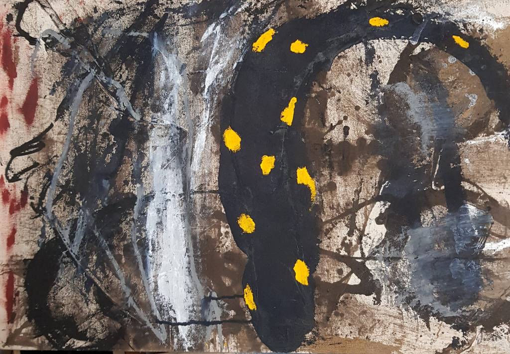 Dai primi anni “90 (e fino al 2010 circa), scoprendo le montagne lecchesi, è nata quella che più che passione, definirei un’ossessione, per la salamandra. Un’entità che mi ha sempre affascinato, anche per la sua origine primordiale: questo animaletto amante del sottobosco ha visto scomparire i dinosauri e comparire gli uomini sulla Terra. Una creatura che è facile incontrare nei pressi del Rio Toscio, torrente poetico che nasce dalle piene del Segrino e scorre accanto al Monastero di San Pietro al Monte a Civate. È stato dal suo incontro che ho compreso ancora più a fondo l’importanza di trovare un senso alla mia carne, e l’ho per questo omaggiato con alcune delle mie serie. In questo scenario, un pò solitario e appartato, come piace a me, in questa lunga fase ho instaurato un rapporto intimo e speciale con la natura. Immergevo le tele nell’acqua del Rio Toscio e lasciavo che fosse lei a suggerirmi come e cosa dover dipingere, sempre comunque con lo stile informale che mi ha sempre contraddistinto”.