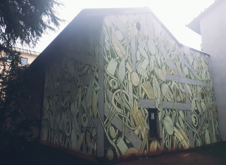 Ed è ancora nel segno del legame forte tra natura e luogo ospitante, che Francesco Carta, aka Crisa, sardo ma dal profilo decisamente diffuso anche fuori dall’isola, nel settembre seguente ha portato una bella fetta di verde in due luoghi importanti per la comunità trevigliese, come sono la Cooperativa Famiglie Lavoratori di viale Piave e il parco della biblioteca civica, nel secondo atto. Una natura rigogliosa e ribelle verso l’oppressione imposta dall’uomo, con un’impronta quasi da illustrazione, ricopre tutto lo spazio disponibile, assediando travi e stecche di legno su cui è abbarbicata, in una risposta reazionaria ma comprensibile.
