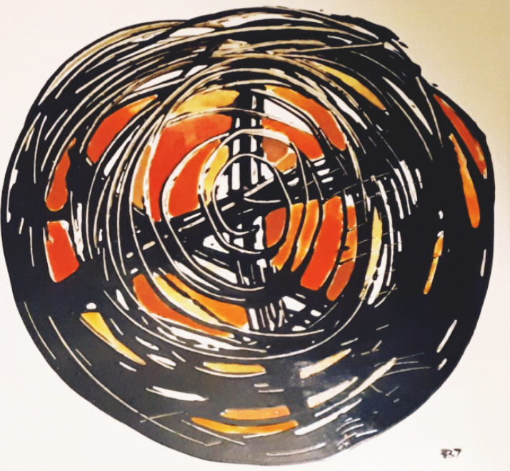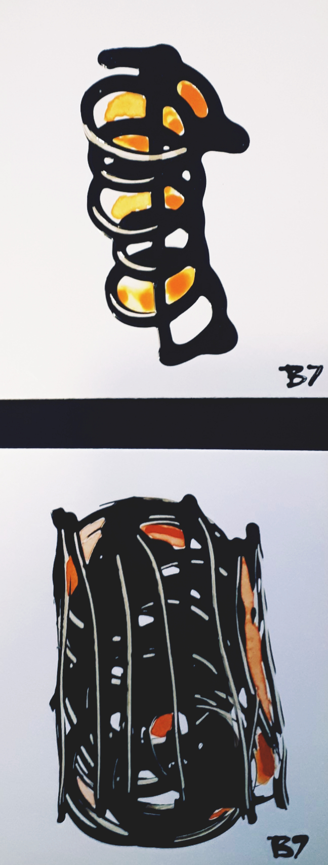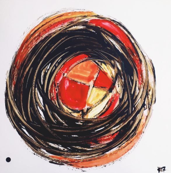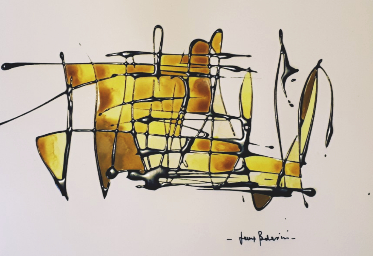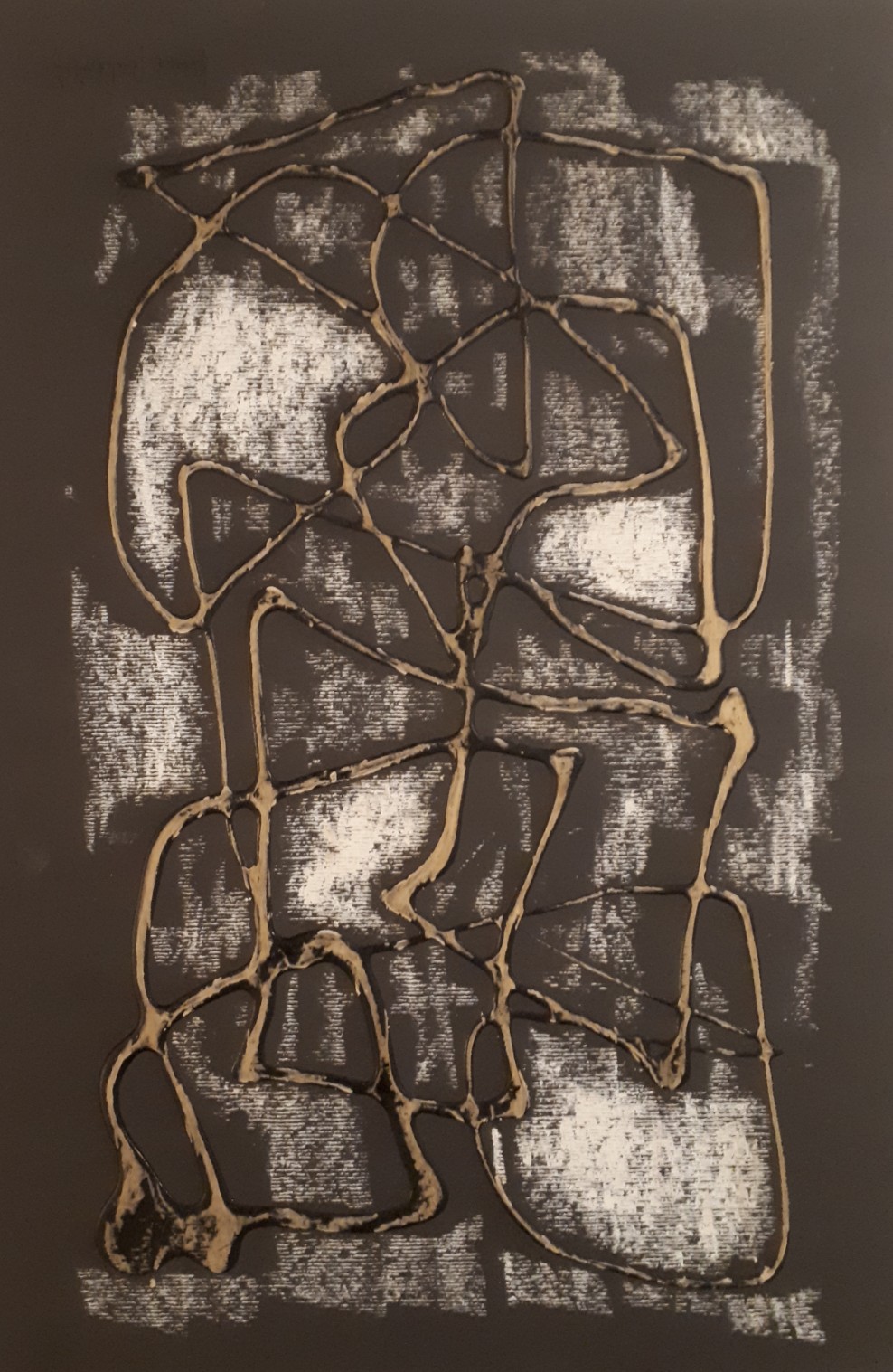 Inevitabilmente centrale ai fini del risultato ottico straniante di queste originalissime elaborazioni appare la tecnica, nel tempo variata e sviluppata secondo una maggiore consistenza. Così dal bitume liquido su tela la formula iniziale è andata strutturandosi, attestandosi sull’uso della vernice bituminosa su carta, mescolata ad altri materiali che donano un gradevole rilievo ai lavori. Elementi dal carattere affettivo, perchè legati alla fervente attività di truccatrice lasciata da Laura, svariano dagli smalti ai glitter, rimasti nella sua anima, per composizioni dai formati variabili, non per forza vincolati all’esigenza estetica della cornice. Trame di linee nere senza motivi ben decifrabili generano percui spazi in alcuni casi riempiti con tinte dalla forza leggera e pulita dell’acquarello, in contrasto con gli interventi dominati invece dalla linea più “sporca” del pastello ad olio. Altre vie meno impegnate e più giocose, ma non meno caratterizzanti includono tra gli altri il ricorso alla pasta di piombo. Nell’ultimo periodo si intravedono anche pertugi di un figurativismo più marcato, con fiori e volti – che rappresentano la massima parte della sua produzione minimalista – dai tratti ora meglio definiti.