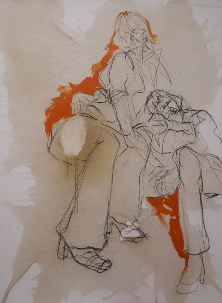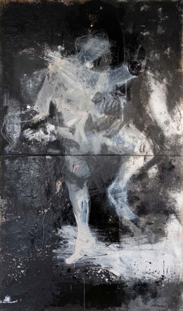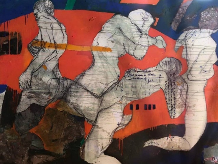 La tensione e l’energia emotiva che è in grado quindi di liberare il suo sentimento artistico, in preda ad un perenne fermento creativo mai domo, si manifesta in spatolate, getti (dripping) e colate di colore, impasti cromatici, resine, scritte di ritagli di giornale, che creano composizioni dotate di grande dinamicità e instillano una forte carica all’insieme. La disorganicità finale che deriva è dunque solo apparente, frutto di un’impressione furtiva spazzata via da un’armonia di fondo studiata. E se oggi la sua dimensione dominante è l’astratto, nonostante le frequenti “comparse” di linee umane, per lungo tempo la sua “stella polare” è stata proprio il figurativo. A rivelarcelo sono i bozzetti disegnati a grafite che spuntano da ogni angolo del suo studio, che riproducono linee del corpo, basati sui modelli dei grandi maestri del passato. D’altra parte il confronto con l’altro per lui rappresenta una via necessaria per sperimentare nuovi percorsi ed essere continuamente stimolato.