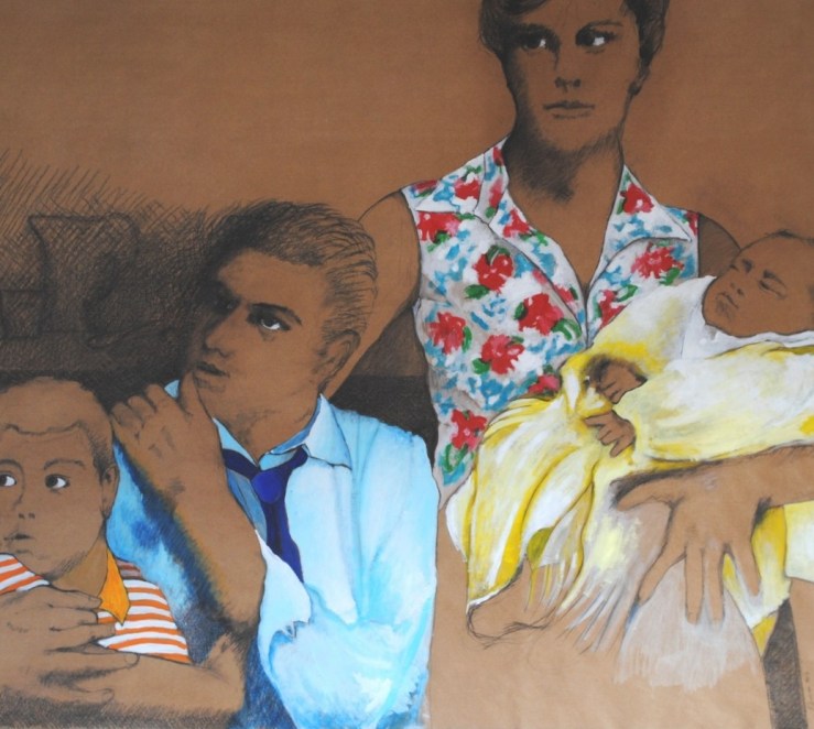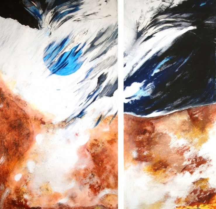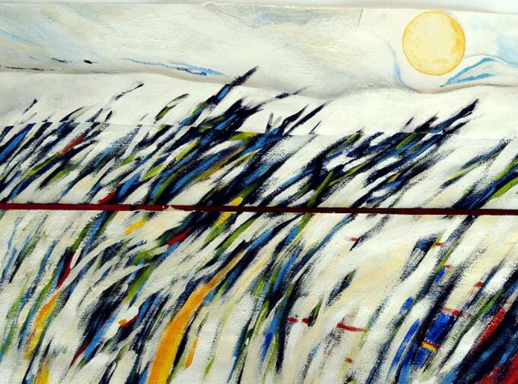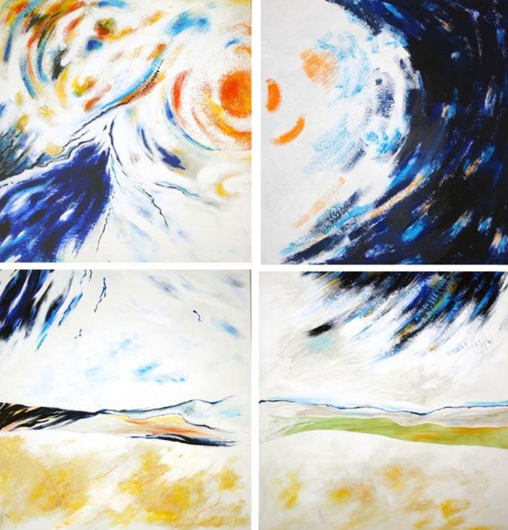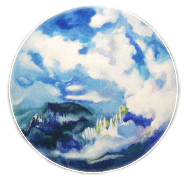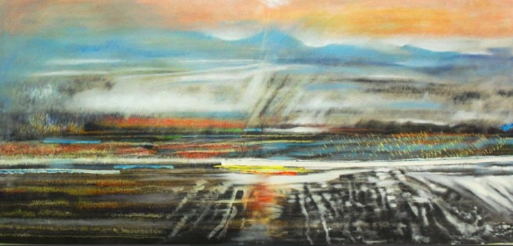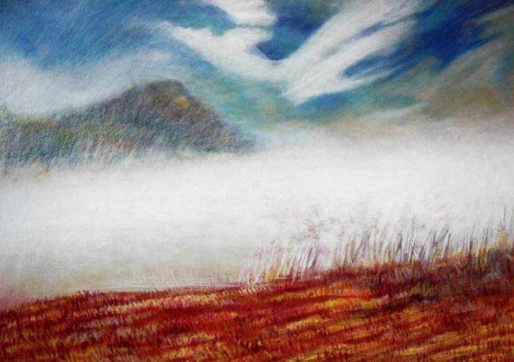Il passo successivo è stato dedicare del tempo anche alla pittura. “Ho sentito l’esigenza di spazi più ampi e ho realizzato opere sempre su carta (che spesso poi viene intelata) usando terre, pastelli e matite, volendo in questo modo mantenere un legame con il gesto incisorio e con l’uso della carta”. Opere celebrative della sfera naturalistica, che pongono spesso in risalto un tondo – sole o luna -rischiaratore, come testimoniano i titoli di una serie di lavori, Nuovo Mondo, o scorci di Alta Quota, o di versanti montuosi che richiamano i propri luoghi di origine, esposti a Padova, Milano e ancora al Museo Dino Formaggio col titolo Nautica Celeste, preso in prestito da una poesia di Andrea Zanzotto, noto poeta dei Colli Euganei.
