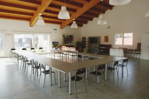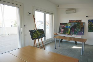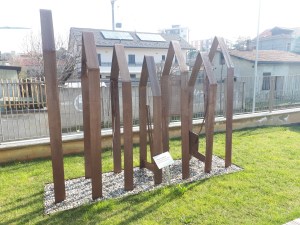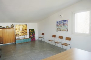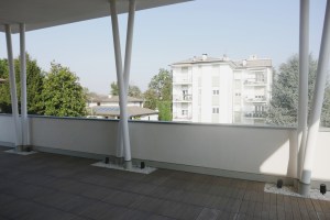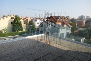 Proseguendo al primo livello, troviamo ambulatori per prestazioni infermieristiche e fisioterapiche, un bagno attrezzato per l’igiene delle persone ammalate o anziane, uffici e sala riunione dell’associazione; e al secondo piano, un locale destinato a laboratorio per attività manuali tenuto dall’associazione onlus monzese Facciavista, riservate a ragazzi con lo spettro autistico, si collega all’esterno ad un ampio terrazzo parzialmente coperto, che nelle giornate di sole consente ai frequentanti di godersi con un po’ di sforzo d’immaginazione, una piacevole evasione nel cielo, mentre a tenere compagnia sono le figure umane stilizzate di Carlo Guzzi, tutt’altro che invadenti, appartate in un angolo del terrazzo.