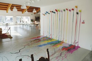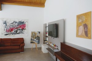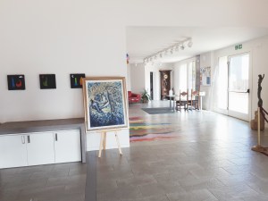Dopo un incipit d’impatto emozionale così forte, lo spazio sembra moltiplicarsi nel luminoso salone polifunzionale e dallo scenografico soffitto ligneo, dove dalle ampie vetrate nelle giornate serene filtra luce vitale. L’estasi raggiunge in fretta vette impensabili se ci si sofferma per un istante a comprendere la sola idea che può aver ispirato le lance confitte nel muro de I Guardiani del Tempio. Un’opera da grandi contesti d’arte, del versatile Armando Marrocco, già artefice del portale bronzeo del Duomo di Lecce e di svariate testimonianze scultoree disseminate nella sua terra salentina. È chiaro che un ambiente così stimolante sia ideale per favorire la socializzazione di persone in solitudine e a rischio emarginazione. Da qui la scelta convinta di abbellirlo con la forza espressiva dell’arte. L’itinerario all’interno della Casa si presenta costellato qua e là da inconfondibili dipinti, vivaci e dall’immancabile motivo floreale di Alessandro Consonni: è lui nel 2015, quando la costruzione dello stabile di nuovissima concezione e a forte efficienza energetica è ancora in divenire, ad inaugurare il filone artistico del nascente centro, con una mostra precorritrice di questo futuro versante fortunato riservato all’arte, che negli anni a seguire l’associazione ha deciso di strutturare.