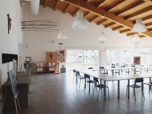 Varcando l’ingresso si ha la conferma di trovarsi di fronte a un progetto fuori dagli schemi ordinari per l’idea. Concezioni stilistiche anche distanti si intrecciano con stupefacente armonia nell’area di accoglienza, dominata dalla gioia cromatica in forma di resina che da decenni catalizza la ricerca visiva del creativo monzese Roberto Spadea. Mentre subito a fianco, l’atmosfera torna a farsi più seria e sacrale, con l’angolo di spiritualità ispirata dalla crocifissione bronzea Luce di Salvatore Vassallo, e dalla seduta di Papa Francesco – utilizzata in occasione della storica funzione del 2017 al Parco di Monza –. Un oggetto che qui ha trovato dimora dopo l’attesissimo evento che ha riunito milioni di fedeli nella Brianza, e che a Vedano (dove ricade come parrocchia il territorio del Parco) è custodito come un gioiello spirituale, simbolo e ricordo di un’occasione irripetibile.