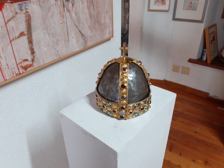 Lui però va particolarmente fiero, e non potrebbe essere altrimenti, della sua copia della Corona Ferrea e della riproduzione dell’Elmo di Costantino. È il Comune di Monza nel 1985, all’epoca di una sua maestosa antologica alla Villa Reale di Monza, impreziosita da circa 300 pezzi sparsi in 29 delle sfarzose stanze regali della magione teresiana, a commissionargli la realizzazione di 26 placche, come quelle che compongono la base del pezzo iconico e riconosciuto simbolo ultramillenario di Cristianità, custodito nella Cappella di Teodolinda del Duomo di Monza. Lui sceglie placche solo di materiale meno pregiato, d’argento dorato, e non d’oro, ma alla vista identiche al riferimento originale. Variata in corso la committenza, con 12 di quelle piastre Bruno realizza due copie del modello (una esposta nel Museo del Tesoro del Duomo di Monza, ma spesso è in giro per il mondo, l’altra si trova nella sala consigliare del Comune di Monza); volendo però utilizzare tutte le lastre ormai faticosamente create, con altre 6 dà forma a una terza copia che tiene per sé ed esibisce con orgoglio, e con le restanti 8 riproduce l’Elmo costantiniano (l’originale è perduto), che la leggenda narra contenesse uno dei chiodi recuperati sul Golgota dalla madre dell’imperatore tardo-cristiano. Anche questo è custodito nel suo magico laboratorio delle arti.
