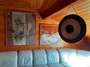 La compagnia di teatro sperimentale Oloart, fondata nel 1997, e il Festival Biennale d’Arte Contemporanea La Voce del Corpo di Osnago (ideato nel 2009), sono la conseguenza naturale di questa scoperta dell’universo spirituale orientale, da lui già approfondita negli anni “80 con la pratica diretta dello Yoga. Ma già in giovanissima età si scorge la fertile anima di artista che lo guida, se è vero che ben presto impara a maneggiare con personalità gli strumenti dell’orafo al pari di quelli della pittura. Poi arriverà anche la scultura, approfondita con una modalità polimaterica che mescola bronzo, tela, legno, gesso, mattone in composizioni audaci e mai banali. Nel tempo ha cambiato i luoghi di vita, ma il suo tasso di assorbimento per ciò che lo circonda, specialmente per quanto è spirituale (il bianco e il rosso sono altamente indicativi del suo gradimento per tutto ciò che ha a che fare in qualche misura con la religione, il mistero e la passione) è rimasto invariato. Da Mantova a Milano, fino a Montevecchia, dove risiede tuttora. Mentre è a Osnago che dagli anni “90 ha fissato il suo spazio della creazione e di evasione personale, in questo lembo tranquillo del parco regionale del lecchese, in uno scenario bucolico ideale per farsi trasportare dai sensi. Il suo “regno” è uno studio che guarda su una caratteristica corte del centro storico, un immobile dal sapore antico, con legno a vista, suddiviso in quattro piani che espongono i lavori di una vita. In questa attraente selezione di proposte tutte molto elaborate, dove il sentimento e l’emozione sono materie prime, spiccano senza fatica i suoi collage pittorici, densi di sostanze e di materia, a rispolverare la concretezza dei muri della sua dimora mantovana travolti dal fuoco della guerra, che ancora vivono in lui dall’infanzia come fantasmi stimolatori della creatività. In un ambiente per forza di cose un po’ disordinato visto il tipo di mente assorbente che lo abita, si fanno spazio anche le sue scenografie, pensate come cornici per spettacoli piuttosto che come “arredi” di arte urbana da vivere. E poi collezioni di strumenti musicali e sculture minimali ricavate nei legni dalle tonalità più svariate.