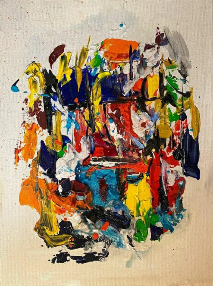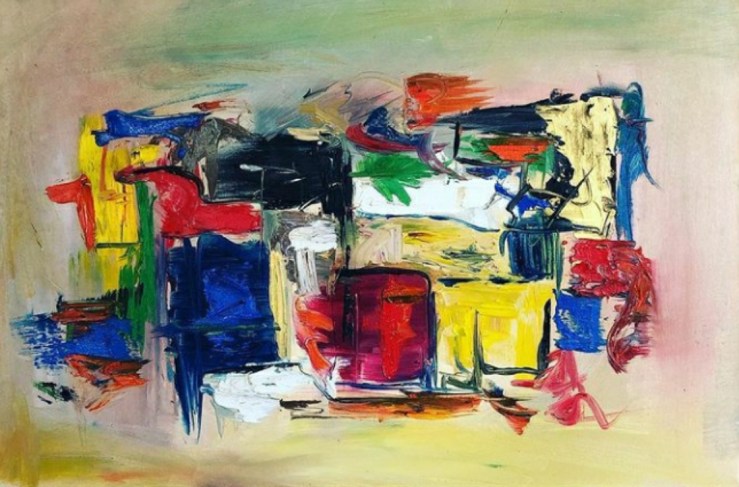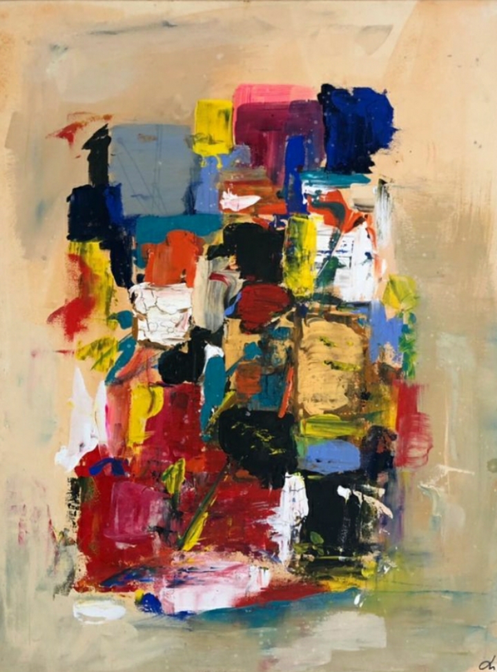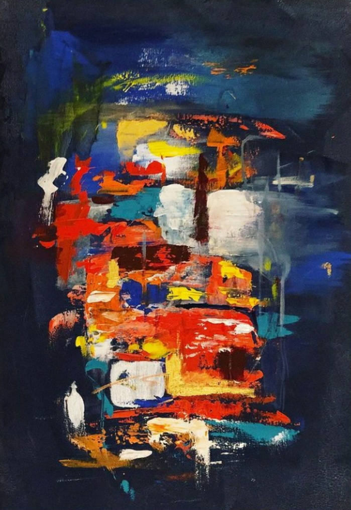 Anche con i consigli di Chevalier sono maturato e nel tempo ho acquisito uno stile sempre più mio, assestandomi su un’impostazione espressiva che ancora mi porto dietro, fondata su un mix di tonalità fredde e vivaci, dal forte richiamo espressionista, dove la scomposizione geometrica risalta notevolmente. In alcuni quadri mi capita di subire ancora molto il fascino della sua “lezione”, non solo nell’accostamento delle piccole campiture cromaticamente diverse, ma anche ad esempio nella partizione delle scene in due fasce delimitate dalla linea dell’orizzonte, una caratteristica tutta sua”. Michele si cimenta in composizioni ad olio, in acrilico e ad acquarello, senza porsi con la presunzione di mettersi in evidenza nel disegno – nel suo bagaglio può contare sui rudimenti di disegno tecnico del corso di laurea in Ingegneria Industriale –, perchè non è nemmeno questa la sua ambizione principale: cerca piuttosto, attraverso il motivo geometrico astratto, di sostenere come un ponte fantastico in sospensione la nostra immaginazione, invitandola a comporre forme, a volte profili rinomati come gli inconfondibili “colli lunghi” di Modigliani. Ma sempre con lo spirito leggero e goliardico di chi sa anche non prendersi sul serio e dipinge per pura passione, mettendola davanti ad ogni interesse e necessità. Quindi giocando con i titoli delle opere, magari trasformando la bellezza de La Ragazza col turbante di Vermeer nella preoccupazione de La Ragazza turbata. E ricercando nella stesura del colore una resa materica che valorizzi l’insieme.
