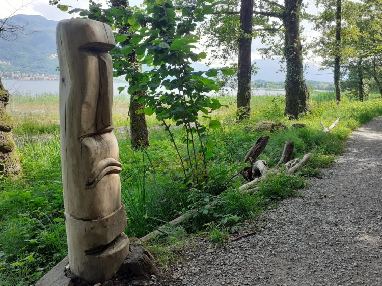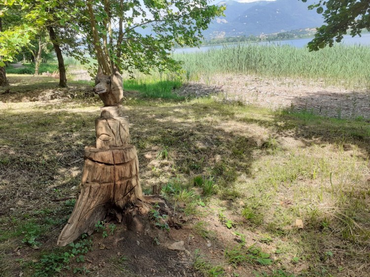 E in soccorso del progetto del comune è giunto un concittadino, Maurizio Chiamone, che armato di motosega, ha foggiato delle creature animalesche che ben si integrano al tipo di contesto ambientale. Intagliati nel legno, coccodrilli, tartarughe, delfini d’acqua dolce, ma anche qualche bella trovata che calza a pennello con il tempo del Covid, e personaggi dall’aria tribale, hanno preso vita animando un luogo già molto amato per la tranquillità dominante, che ora ha acquistato anche un gradevole valore aggiunto estetico. Presenze simpatiche che arricchiscono di poesia il tratto costiero più suggestivo del lago maggiore (per estensione) fra i bacini di origine prealpina dell’area briantea.