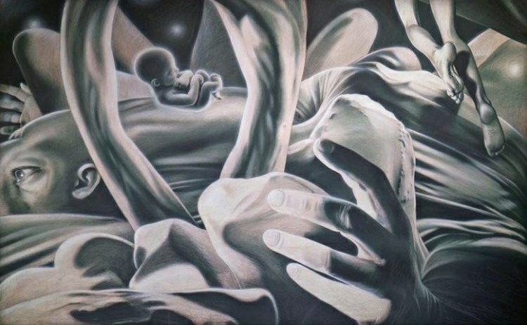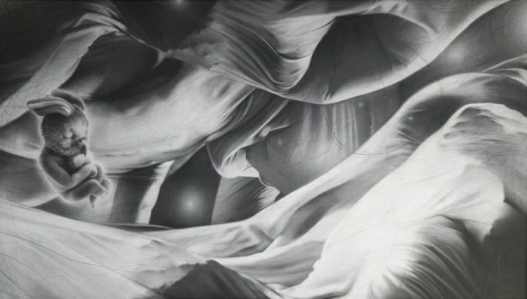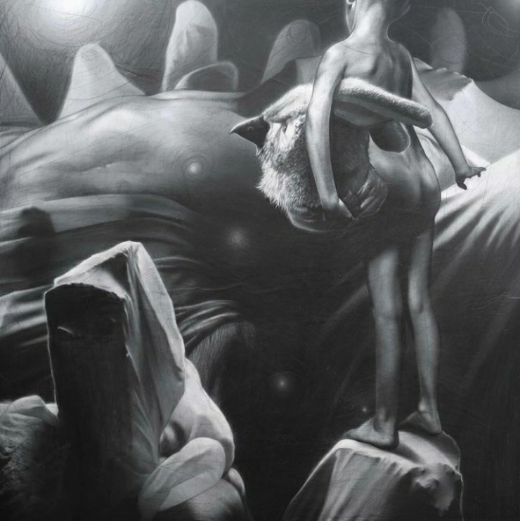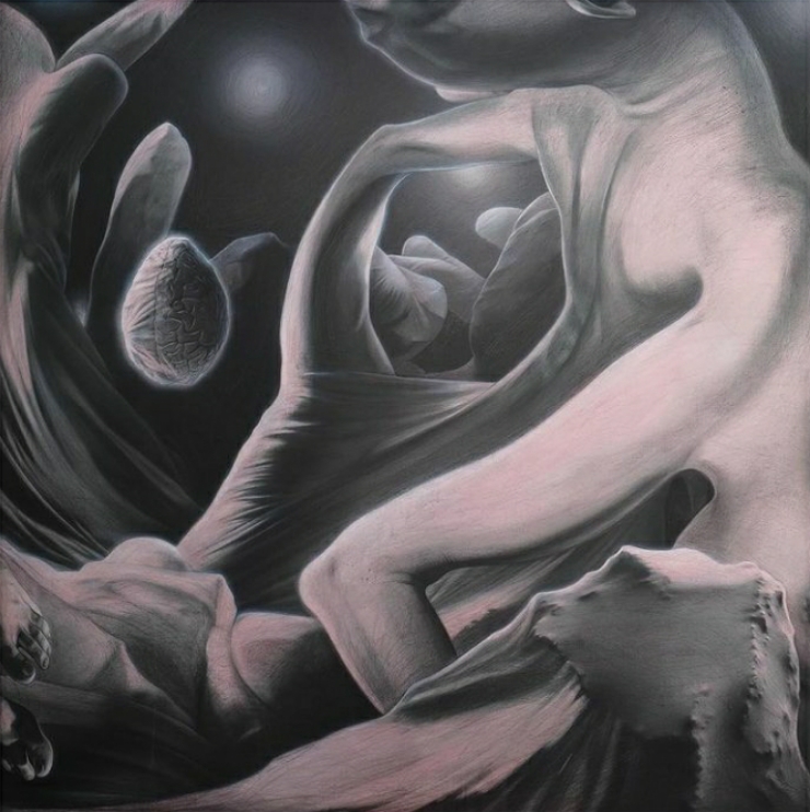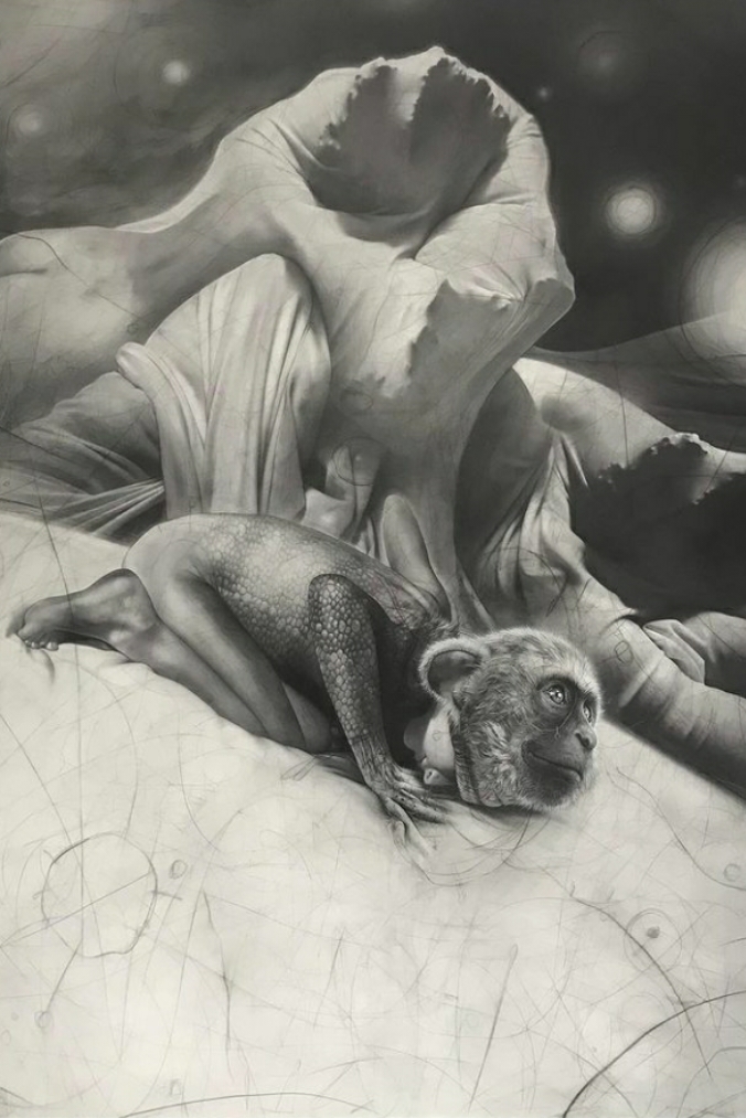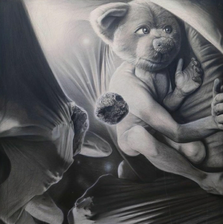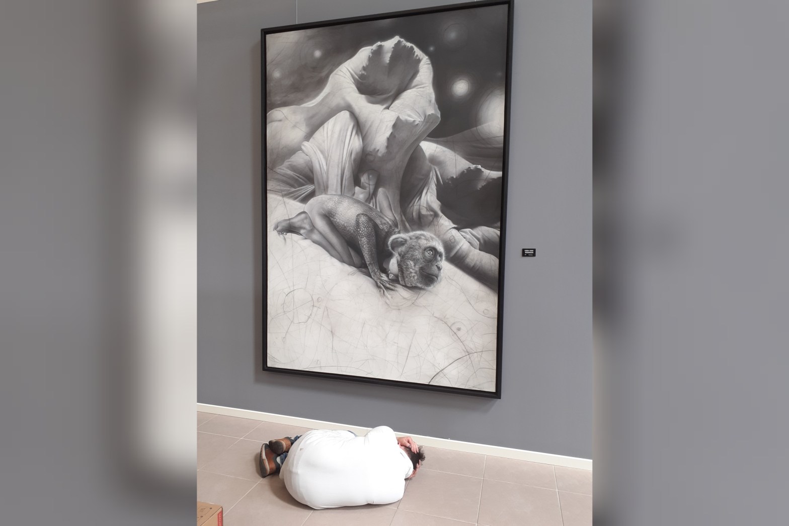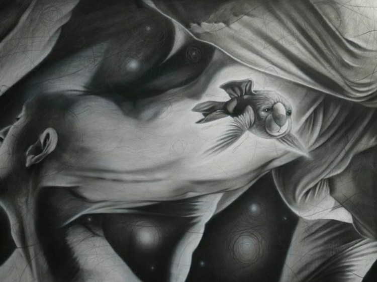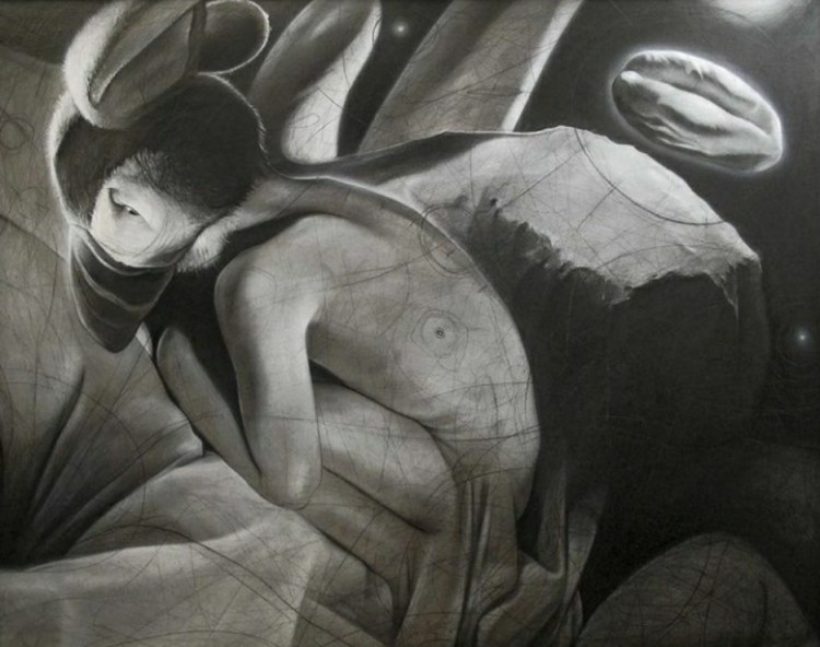 E a ricordarci che questo stato non risparmia proprio nessuno concorrono quelle sfere sparse apprezzabili sullo sfondo e non solo, altri micro-cosmi di altrettante persone che come noi vivono la medesima sorta di dramma misto a stupore esistenziale. Quei segni netti ben visibili che costellano la superficie simboleggiano le nostre esperienze di vita che non fanno che acuire questo ribollìo interiore per ‘ciò che sarebbe potuto essere’ “. Il forte paradosso di questa raffigurazione bicromatica, che trova la massima espressione probabilmente nei lavori introdotti nel titolo da Libero Cerbo (libero cervello), e che amplifica la dimensione irreale, si realizza nell’assoluta mancanza di soggetti puramente umani. Ma come si rende nel concreto questo meccanismo? “L’impronta visionaria viene rafforzata utilizzando una tecnica mista che crea più strati e si serve di grafite, acrilici, inchiostro, e di un’emulsione di gesso e alcol per sciogliere le aree a grafite. Si forma così quella patina sensazionalizzante tipica della sostanza evanescente dei sogni. L’impostazione in bianco e nero invece annulla le diverse sfumature di vedute, anche minime, che ogni essere gioco forza ha rispetto a tutti i suoi simili sul mondo”.