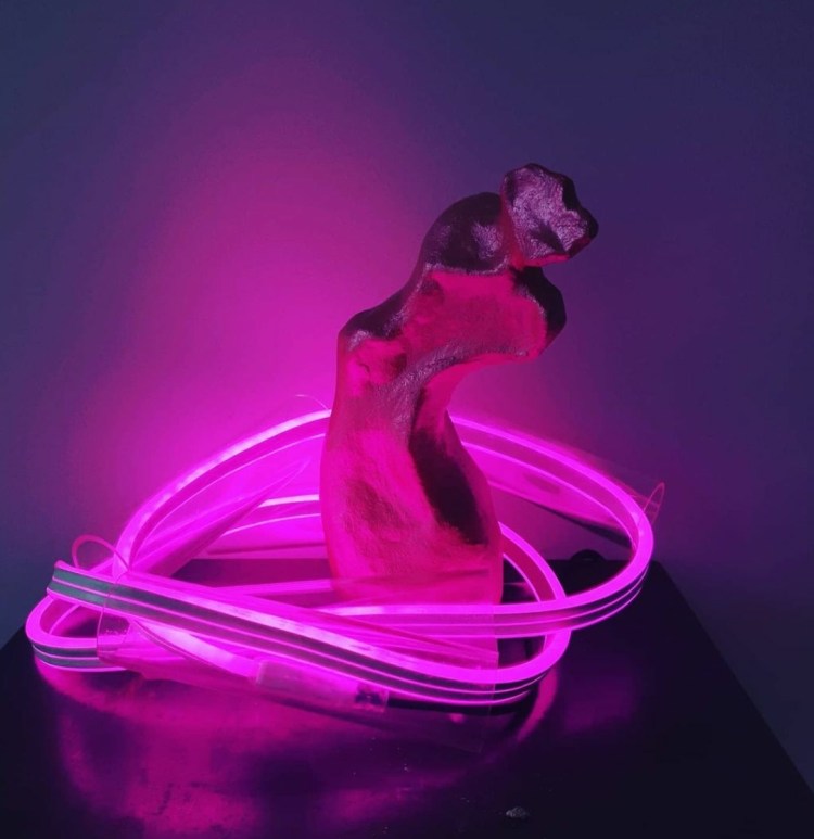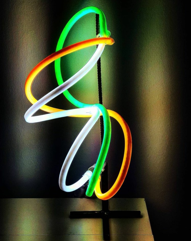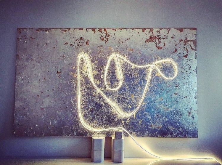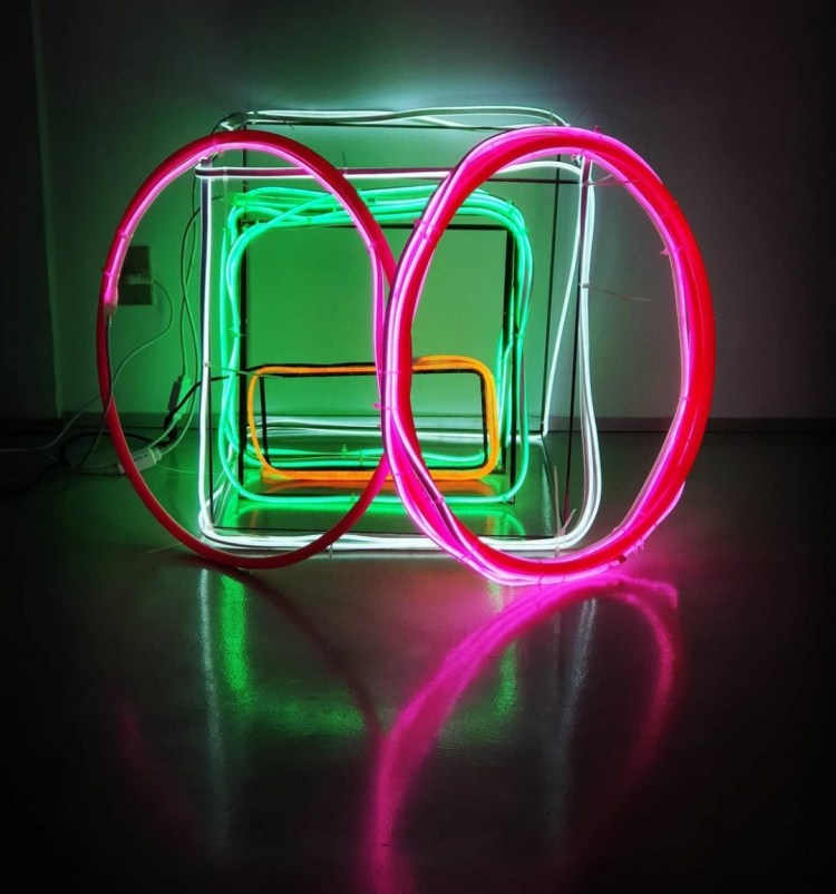 Ma il neon dinamico, che su di lei esercita lo stesso fascino delle immortali sculture luminose di Dan Flavin, non ha “oscurato” gli altri versanti ispiratori, che continua a coltivare, comprese le installazioni componibili con i calchi di solidi geometrici cubici o cilindrici in dialogo con il ferro, a cui difficilmente l’artista sa rinunciare, certamente dall’impronta più grezza rispetto all’eleganza delle idee luminose, da testare nella loro essenza più intima in modalità notturna. La resistenza del ferro non esclude però la nobiltà dell’oro, su cui Sabine ha trasferito temporaneamente le sue energie alla Galleria Arianna Sartori di Mantova, all’interno di una collettiva tutta al femminile allestita un soffio prima del ciclone pandemico a inizio 2020, in un binomio oro-donna decisamente apprezzabile per l’immagine del gentil sesso. Non ancora sazia di sondare terreni inesplorati, la sua voglia incessante di sperimentare l’ha fatta approdare ad un capitolo ancora più inedito e in parte sintesi della sua attività, rappresentato da quadri dipinti ad olio e valorizzati da neon variopinti. Uno sviluppo sorprendente che testimonia come la “ricerca luminosa” non sia per lei un approdo, ma piuttosto un punto di partenza da cui iniziare a lavorare senza sosta con la fantasia, aggiungendo nuovi livelli di attrazione luminosi.